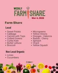 Please try to order farm shares by Monday. Pick up farm shares Wednesday after 10 AM - Sunday 4 PM.
